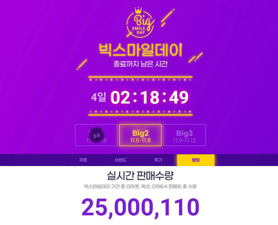 이베이코리아는 G마켓과 옥션, G9에서 진행 중인 ‘빅스마일데이’ 행사의 누적 판매량이 2500만개를 넘어섰다고 9일 밝혔다고 합니다.