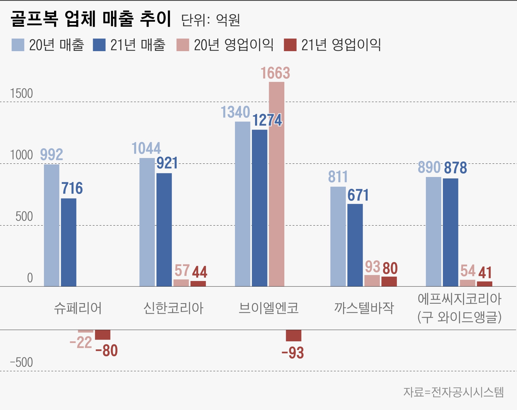 루이까스텔을 갖고 있는 브이엘엔코도 매출(1274억원)이 5% 감소하고 영업손실 93억원을 냈다. 이들 역시 10년 이상 골프복을 판매해 온 전문 골프복 업체들이다. 패션그룹형지가 2015년 출범한 골프복 까스텔바작(308100)도…