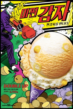 우선 베스킨라빈스는 10월 이달의 맛으로 '미찐 감자' 아이스크림을 출시했다고 합니다. 맛 미(味)와 찐 감자를 조합한 제품으로 DC코믹스와 협업하여 캐릭터 조커를 연상케하는 '미치게 하는 맛있는 맛!'이라는 문구를 적용했다고 합니다.