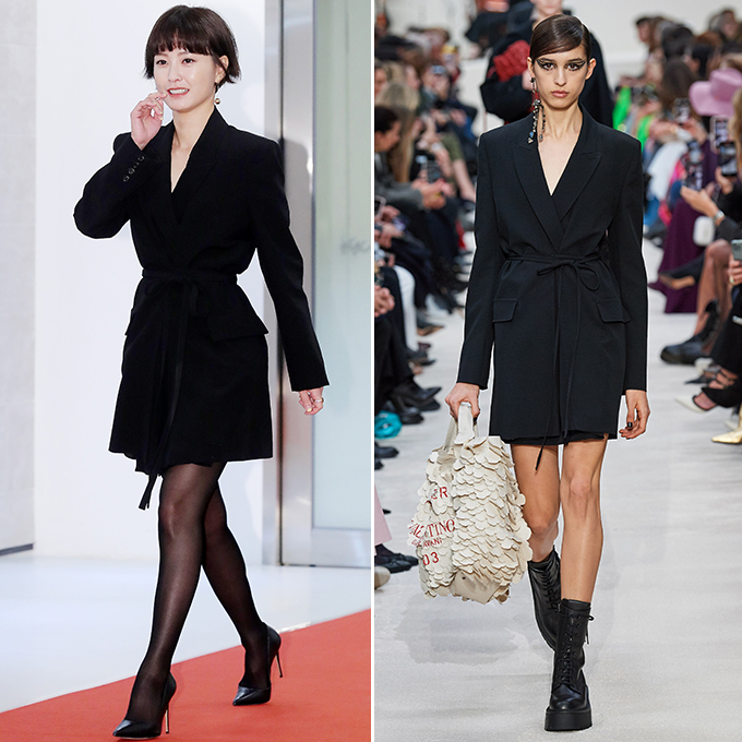 그는 살이 비치는 스타킹과 포인티드 토 하이힐을 신고 세련된 올 블랙 룩을 연출했다. 정유미는 볼 팬던트가 달린 드롭 이어링과 볼드한 반지를 양손에 착용하고 올 블랙 룩에 골드 주얼리로 포인트를 더했다. 정유미가…
