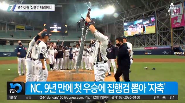 한국시리즈 정상에 올랐습니다. 창단 첫 우승이라 참 이야깃거리가 많았는데요. 특히 NC의 구단주의 김택진 대표의 집행검 세리머니가 큰 화제가 되고 있습니다. 안진용 기자, 어떤 세리머니를 펼쳤는지 자세히 설명…
